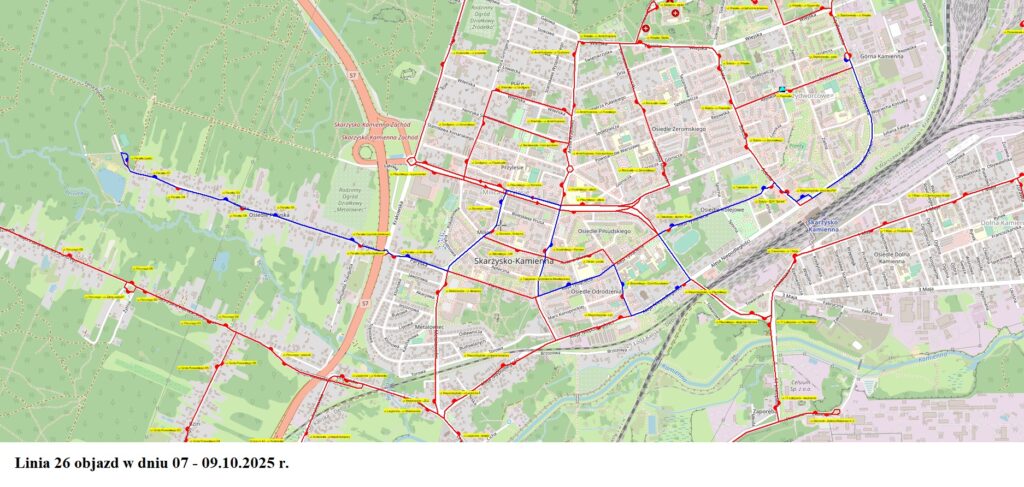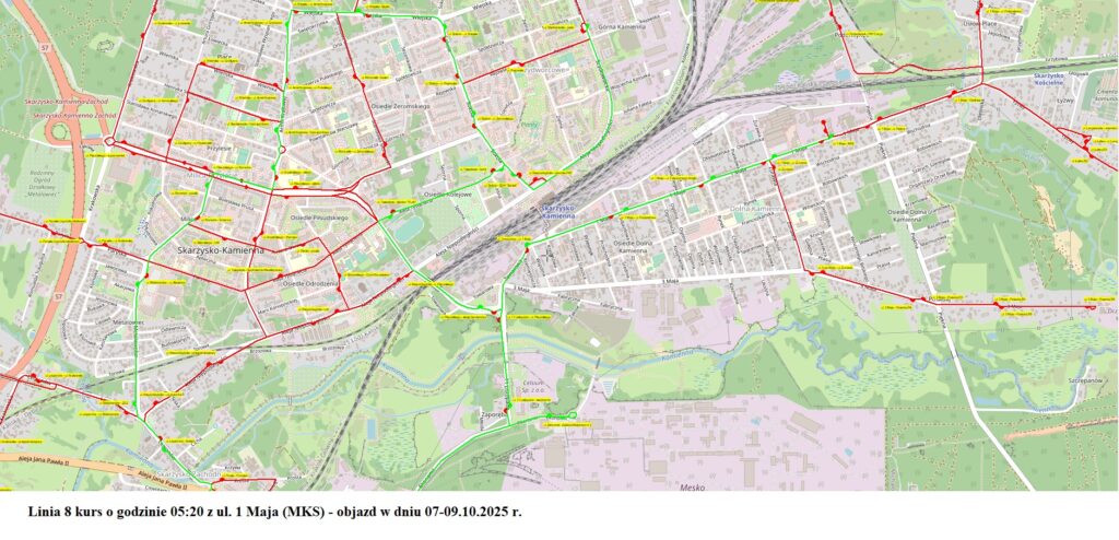 * Kurs rozpoczynający się o godzinie 05:20 z ul. 1 Maja (MKS) przebiegać będzie według rozkładu jazdy do ul. Tysiąclecia (bank) godz. 05.53, następnie ul. Sokola (SDH „Bartek”) – ul. Szydłowiecka (pętla).